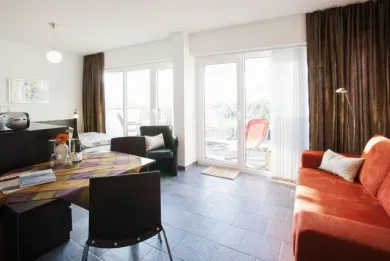 - Ein-Raum-Appartement mit 35 m² für 2 Personen mit Balkon, integrierter Küche, Dusche/WC, Doppelbett und Schlafsofa als zusätzlicher Schlafmöglichkeit.