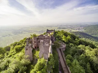 Von der Burg aus hat man einen traumhaften Ausblick über die Rheinebene und den Pfälzerwald. Ein kleines Restaurant auf der Burg sorgt für zünftige Speisen. Die Burgschänke lädt bis zu 40 Personen zum Umtrunk ein.