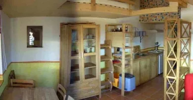 - Im Wohn-Eßbereich steht eine kleine Sitzecke und der Eßtisch. Schlafen können Sie wahlweise im Hochbett oder auf den ausziehbaren Sesseln der Sitzgruppe.