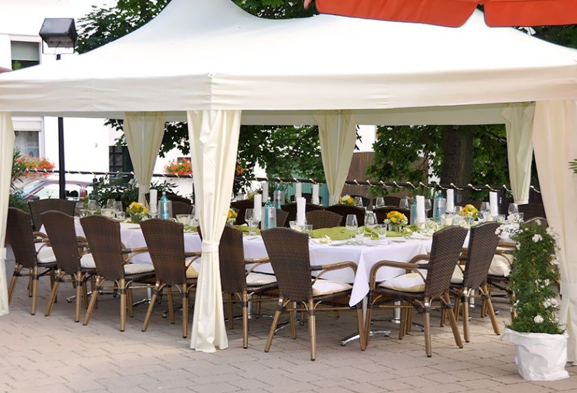 Im Sommer genießen Sie die ausladende Terrasse unter dem alten Ahornbaum. Genügend Schatten und der satte Ausblick auf den Röhrbrunnenplatz versprechen Ihnen wunderbare Abende.