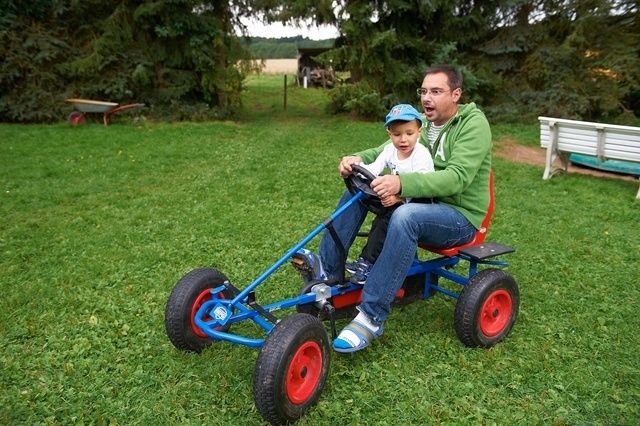 - Große Spiel- und Liegewiese mit Schaukeln, Rutsche, Hüpfburg, Tischtennis, Sandkasten, Kletterbaum, künstlichem Bachlauf, Trettraktoren, Bobbycars, Kettcars und 4,3 m Trampolin