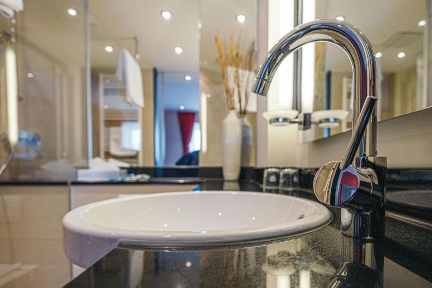 Unsere großzügigen Superior-Badezimmer laden mit ihren edlen Materialien zum Entspannen ein. Selbstverständlich verfügen alle Badezimmer über eine große Ganzglas-Dusche bzw. Badewanne, viele große Ablagen, eine helle Spiegelwand mit Hintergrundbeleuchtung, Kosmetikspiegel und Haartrockner.