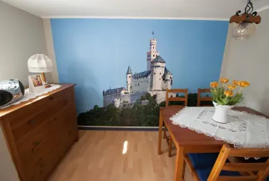 • Wohnzimmer: Das Wohnzimmer ist mit einem Fernseher mit Kalbelanschluss ausgestattet. Dazu finden sie stets eine aktuelle Fernsehzeitschrift vor. Ein DVD-Player ist ebenfalls vorhanden. Eine gemütliche Sofaecke lädt zum Entspannen ein. Um dabei Musik zu hören, steht Ihnen eine Kompaktanlage mit Radio, Kassetten- und CD-Spieler zur Verfügung. Des Weiteren steht eine Auswahl an Büchern für Lesefreunde bereit. Für gesellige Abende sind zudem diverse Gesellschaftsspiele vorhanden.