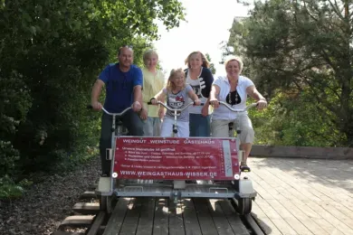 Mit der „Vereinsdraisine“ fahren Sie mit bis zu 7 Personen. 3 radeln und 4 sitzen gemütlich um den runden Tisch hinten, d.h. Sie können z.B. auch ältere Personen mitnehmen, die nicht radeln wollen.