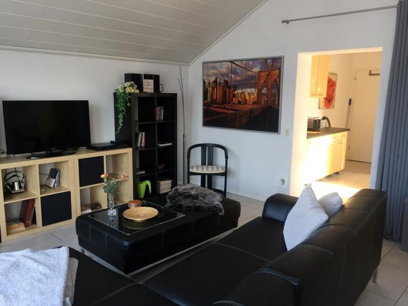 Die Ferienwohnung liegt im 1. Stock unseres Hauses und ist über einen separaten Eingang zu erreichen. Ein Parkplatz befindet sich direkt am Haus. Die Wohnung ist komplett eingerichtet und umfasst einen offenen Wohn-/Schlafbereich mit einem Doppelbett und einer umwandelbaren Schlafcouch, einen Essbereich, eine komplett eingerichtete Küche und ein Badezimmer mit Dusche und WC. Sat-TV und Radio zählen natürlich auch zur Ausstattung. Im Außenbereich steht Ihnen ein großer Garten mit Swimmingpool zum Entspannen und Genießen zur Verfügung.
