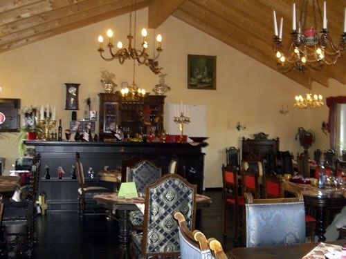 Die antiken Möbel für die Probierstube wurden über mehrere Jahre aus ganz Deutschland zusammengetragen. Über den Möbeln und den daran sitzenden Gästen "thronen" Lüster und Kronleuchter.