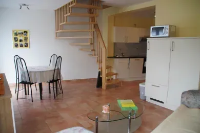 Das Schlafzimmer hat ein Doppelbett. Es befindet sich im Obergeschoss und ist über eine offene Treppe im Wohnzimmer zu erreichen. Zum Entspannen lädt Flachbild TV und eine große Couch ein. WLAN inklusive.