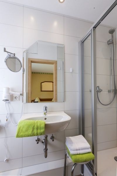 niedrigem Einstieg, Duschabtrennung in Sicherheitsglas, Waschbecken, Badheizkörper mit Handtuchhalter, großer Spiegel + Kosmetikspiegel, Föhn