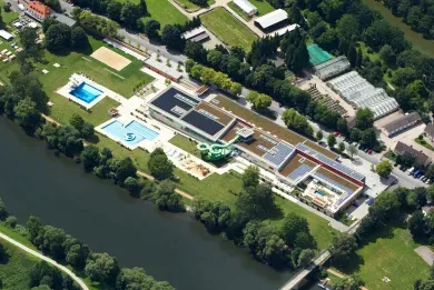 8 wettkampftaugliche Becken mit 50-m-Bahn bieten ideale Voraussetzungen für Sportveranstaltungen. Für Kinder gibt es einen Wasserspielplatz mit Schiffchenkanal. Außerhalb der Becken befinden sich ein Beachvolleyballfeld und eine große Liegewiese.