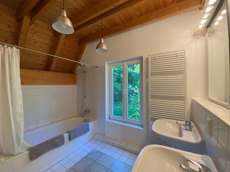 Ein großes helles Bad verfügt über eine  Badewanne, ein WC sowie 2 Waschbecken
