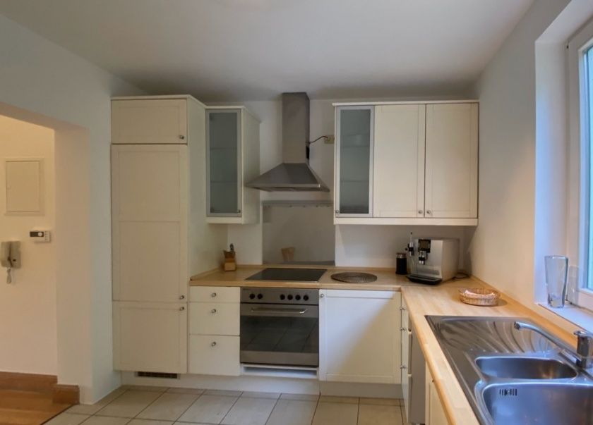 Im 1. Stock befindet sich eine große Küche (mit Herd, Backofen, Kühlschrank mit Gefrierschrank, Spülmaschine, Kaffee-Vollautomaten für Kaffeebohnen, Milchaufschäumer, Toaster, einem Mixstab und Geschirr). Der offene Wohn-Essbereich hat einen Zugang zum Balkon.
