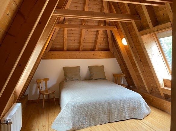 Im 2. Stock liegen die  beiden Schlafzimmer, das grössere Familienschlafzimmer ist mit einem französischen Bett (1,60 x 2,00 Meter) und einem Doppelbett (1,80 x 2,00 Meter), das auch in 2 Einzelbetten umgewandelt werden kann, das kleinere mit einem Schlafsofa (1,60 x 2,00 Meter) ausgestattet.