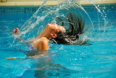 Das Schwimmbad besteht aus einem Schwimmerbecken und einem Nichtschwimmerbecken. Besonders beliebt ist die 50 Meter lange Wasserrutsche.