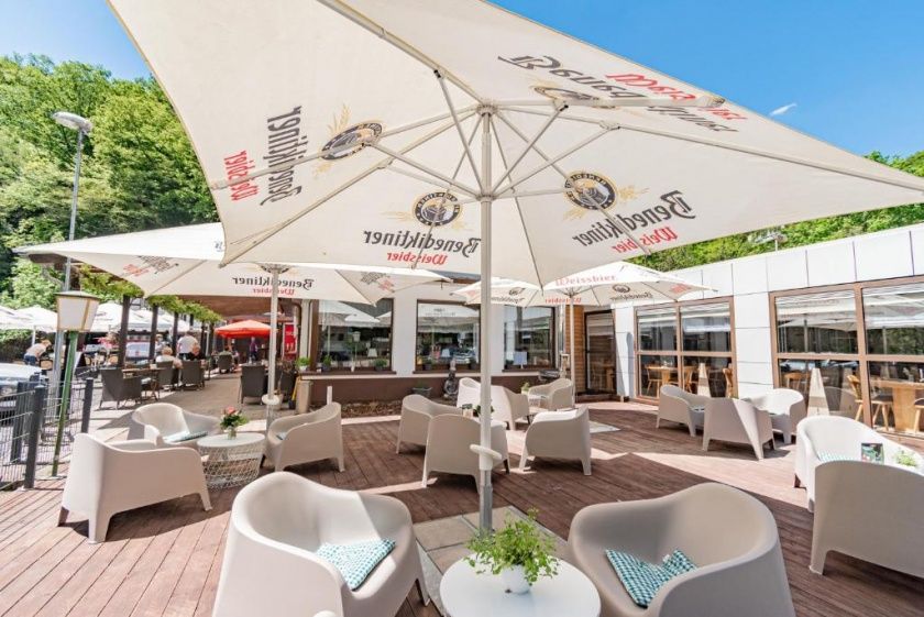 Vor dem Restaurant befindet sich eine große Sonnenterasse mit weiteren 100 Sitzplätzen! Unsere Konditorei versorgt Sie täglich mit allerlei Leckerem zum Kaffee! Eine gutbürgerliche Küche lässt (fast) keine Wünsche offen! Erlesene Weine aus unserer Gegend warten darauf Ihren Gaumen zu erfreuen! Reichlich Parkplätze für Bus und PKW stehen Ihnen direkt vor dem Haus zur Verfügung!