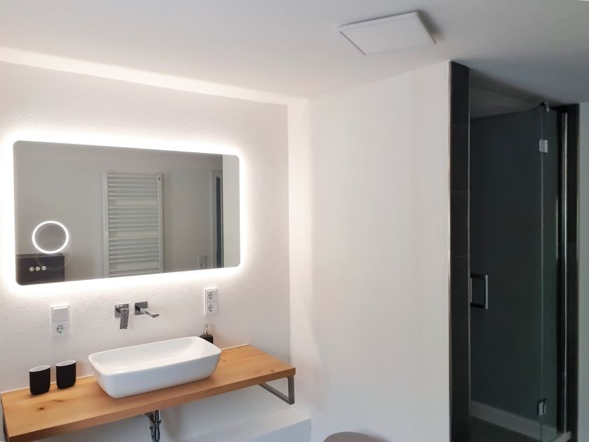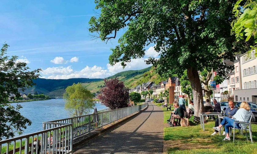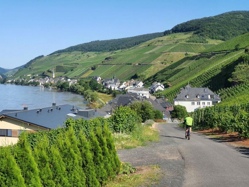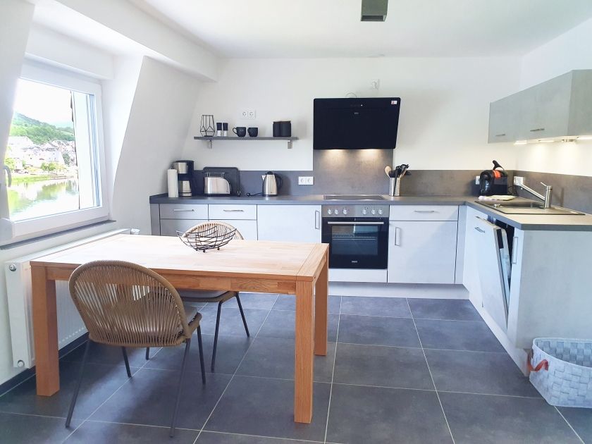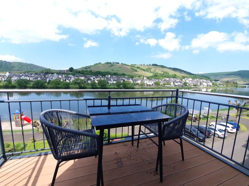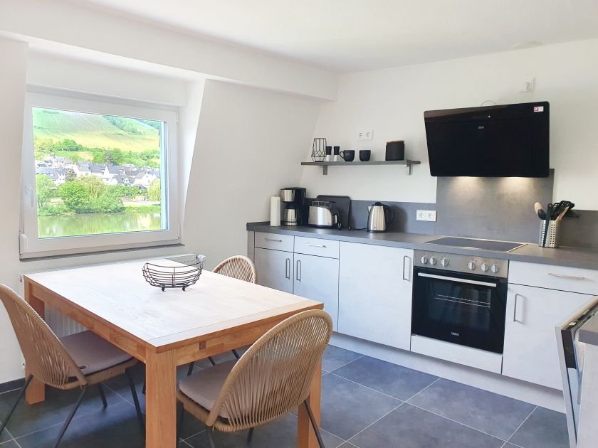 Stilvolle Komfort-Ferienwohnung mit Balkon und traumhaftem Moselblick Alle bodentiefen Fenster zur Moselseite sorgen für eine lichtdurchflutete Atmosphäre. Der helle Wohnbereich lädt mit Flachbild-Sat-TV und direktem Zugang zum südwestlich ausgerichteten Balkon mit gemütlicher Rattan-Sitzgruppe zum Verweilen ein. Die moderne, voll ausgestattete Küche bietet ein Cerankochfeld, Backofen, Spülmaschine, Kaffeemaschine und Wasserkocher – es fehlt an nichts. Erholsamen Schlaf garantiert das ruhige Schlafzimmer mit Boxspring-Doppelbett (1,80m × 2m). Das luxuriöse Bad überzeugt mit einer großzügigen Glasdusche (120 × 90 cm), Handtuchheizung und Fön. Alle Fenster sind mit Rollläden ausgestattet. Zusätzlich stehen eine Waschmaschine sowie ein ebenerdiger Kellerraum mit E-Bike-Lademöglichkeit zur Verfügung. Nichtraucherwohnung, keine Haustiere erlaubt.
