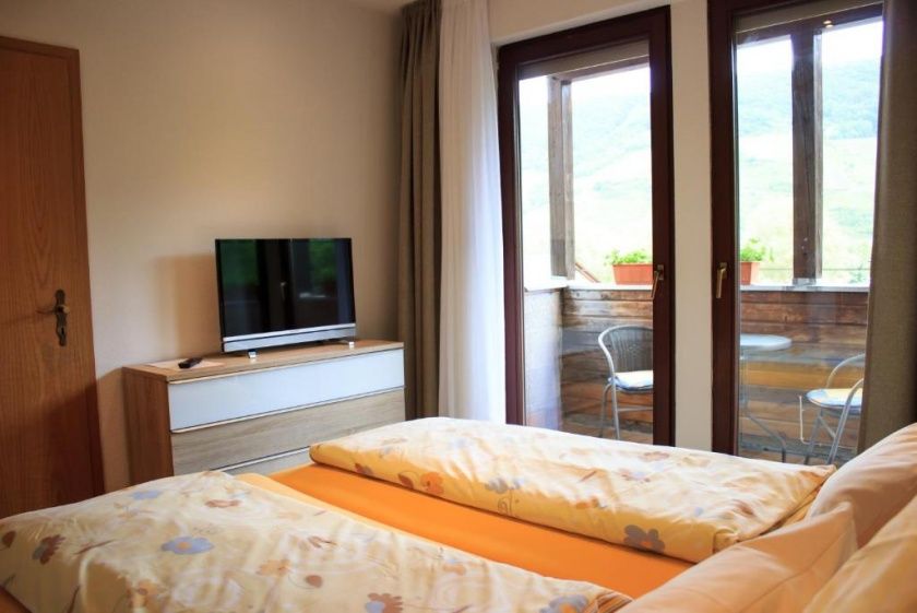 Unsere Apartments (ca. 25 m²) "Bacchus 1" mit Moselblick und "Bacchus 2" mit Berg- und Gartenblick verfügen über ein Badezimmer mit Dusche / WC und Haartrockner, Sofa, Flachbildfernseher, Schreibtisch, Wecker, Radio und Balkon. Die Zimmer sind Allergiker freundlich. Belegung mit max. 4 Personen.