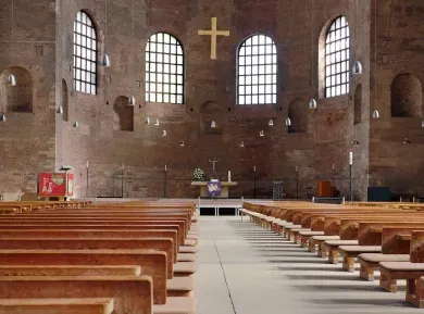 - Heute finden bis zu 1.300 Menschen in dem rötlichen Ziegelbau Platz. Sie schreiten auf weißen und schwarzen Marmorplatten vorbei an seitlichen Mosaiken. Kalte Füße hätten Sie damals nicht bekommen, dafür sorgte die Fußbodenheizung. Wohnen Sie einem Gottesdienst bei oder lauschen Sie einem Orgelkonzert . 2700 Pfeifen sorgen für einen monumentalen Hörgenuss!