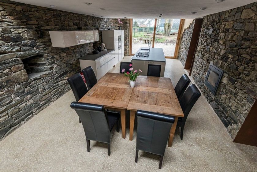 - Highlight des offenen Wohnbereichs ist der beidseitig einsehbare Kamin, der in der bestehenden Bruchsteinwand eingearbeitet wurde. In kalten Herbst- und Wintertagen können Sie wunderbar Ihre Seele baumeln lassen und zur Ruhe kommen.