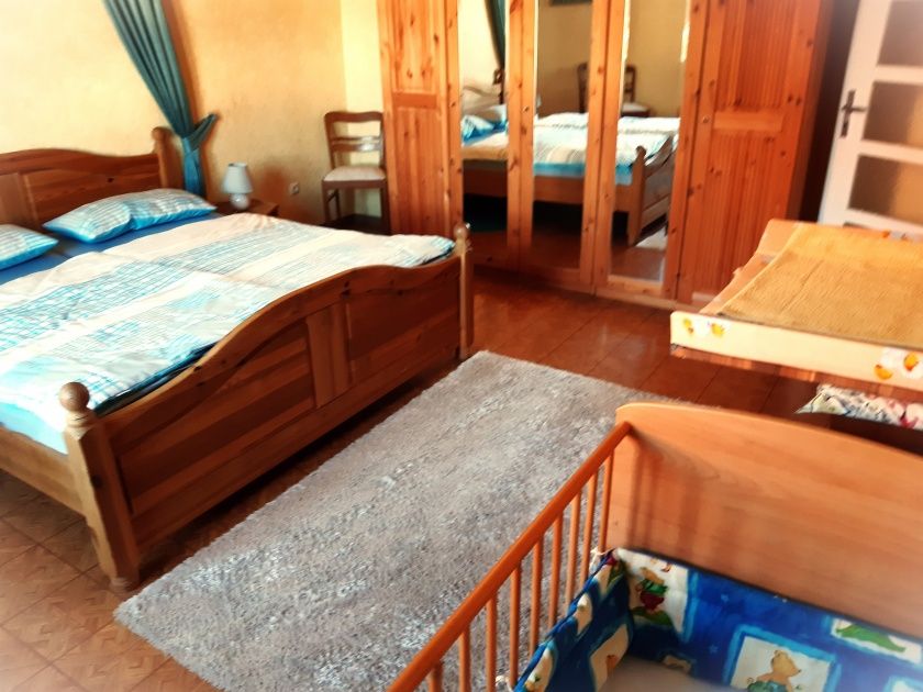 • Schlafzimmer "Bruder Konrad" mit Doppelbett, Kinderbett, Wickelkommode, Windeleimer