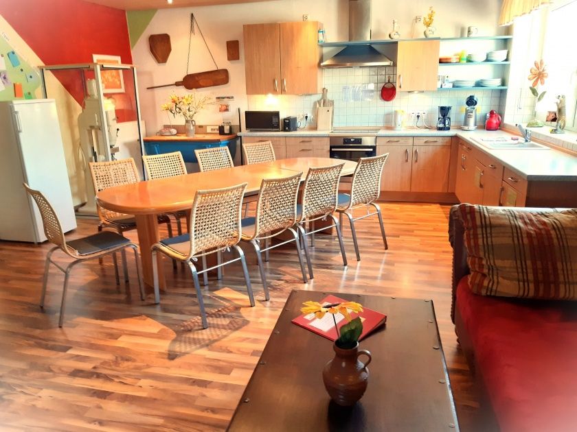 • ca. 40 qm große Küche (mit Kühl/Gefrierschrank, Herd mit Cerankochfeld und Backofen, Spülmaschine, Kaffeemaschine, Wasserkocher, Mikrowellenherd, 2 Kinderhochstühlen)
