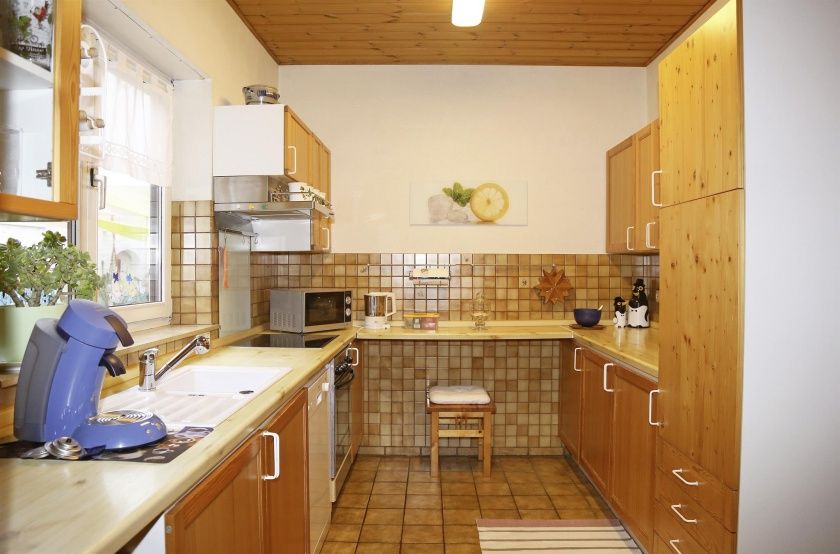- Küche mit Spülmaschine, Mikrowelle, Kühlschrank, Herd, Kaffeemaschine, Wasserkocher, etc.