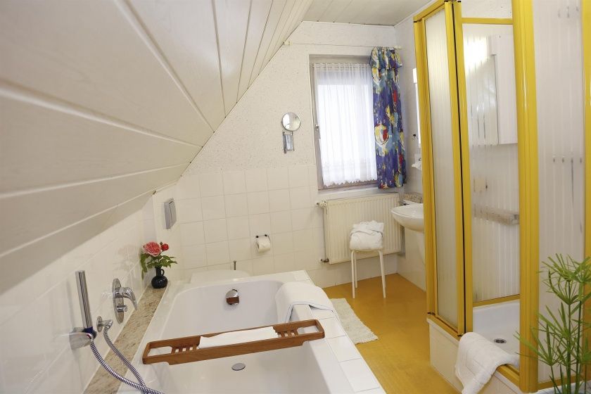 - Badezimmer mit Dusche, WC, Badewanne und Föhn