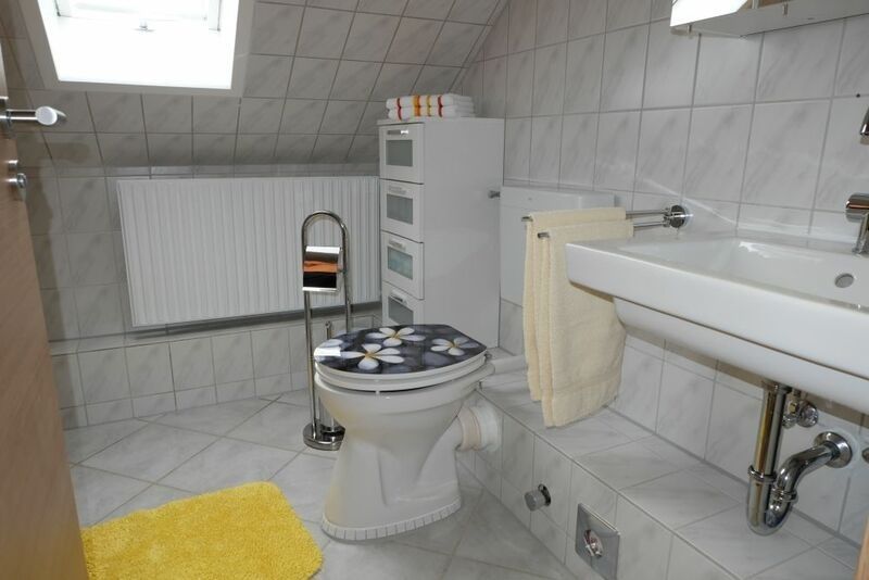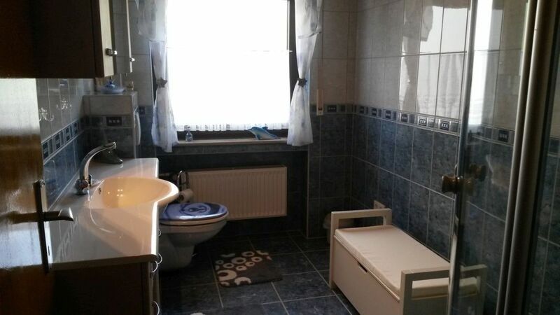• Badezimmer: Waschbecken, Dusche, Toilette, Fenster, Spiegel, Föhn, Handtücher