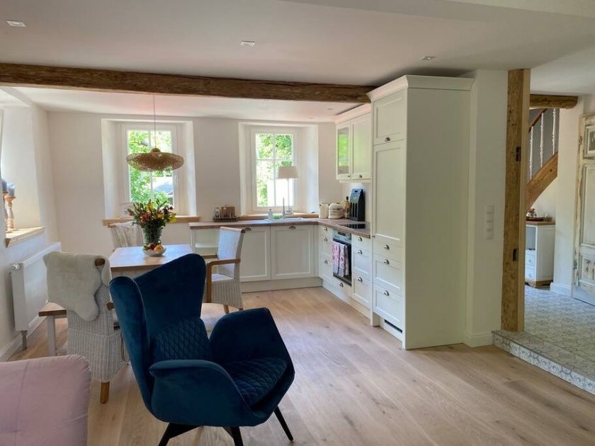 - Das Wohnzimmer mit Essbereich und offener Küche befindet sich im Erdgeschoß. Für kalte Winterabende gibt es einen Schwedenofen von Morsoe, zusätzlich zur Zentralheizung