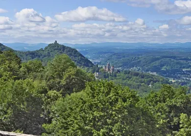 - Wenn Sie die 96 Stufen erklommen haben, werden Sie mit einem tollen Panoramablick über die waldreiche Landschaft mit direktem Blick auf das Hachenburger Schloss und auf das markante Siebengebirge belohnt.