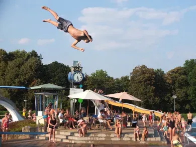 Vom 5-Meter-Sprungturm könnt Ihr Hechtsprünge machen. Weitere Highlights sind ein Strömungskanal, ein Wasserigel und ein Wasserpilz.