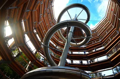 Auf dem Weg zum beeindruckenden Aussichtsturm warten Kletter- und Balancierstationen auf dich. Der Turm selbst fasziniert durch seine einzigartige Holzarchitektur in Form einer aufsteigenden Wendelkonstruktion. Dank einer sanften Steigung von nur 6 % schwebst du nahezu mühelos nach oben.