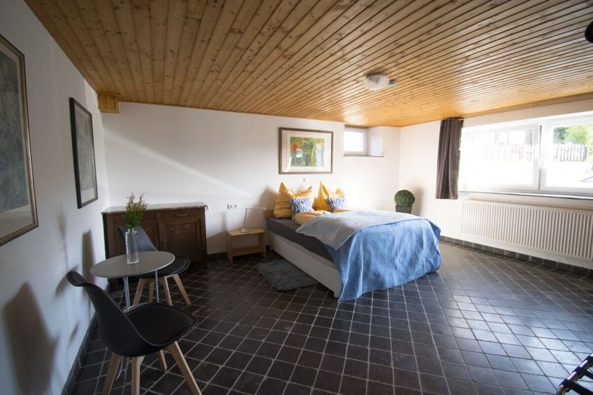 Unsere ca. 50 m2 große Ferienwohnung ist eine Einliegerwohnung mit einer großen Wohn-Ess-Küche, einem Schlafzimmer und einem Badezimmer. Die Wohnung befindet sich seitlich des Haupthauses und ist ruhig gelegen. Der zugehörige Autostellplatz befindet sich direkt vor der Tür. Sie ist barrierefrei zugänglich.