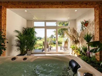 Tropic Room mit Whirlpool, Finnische Sauna u. Kombination Dampfsauna-Duschkabine mit Whirlwanne können kostenlos und uneingeschränkt genutzt werden. Bademäntel und eine Erstausstattung an Hand-u. Duschtüchern werden kostenlos zur Verfügung gestellt.