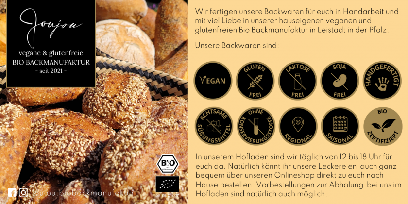 Joujou ist frei von Industriezucker, Hühnereiern und Gluten. Natürlich auch alle Bio Backwaren aus unserer hauseigenen Bio Backmanufaktur sind vegan, glutenfrei, sojafrei, ohne Industriezucker, ohne Koservierungsstoffe und mit viel Sorgalt und Liebe zubereitet.