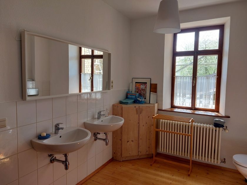 Uns war es wichtig, dass Sie im Urlaub angenehm und komfortabel wohnen. Im Bad finden Sie neben einer Badewanne mit Dusche zwei Waschbecken, WC, Bidet und viel Platz. Im Schlafzimmer steht ein großzügiges Doppelbett mit 2 Matratzen und ein großer Kleiderschrank mit Schnitzwerk. Bettwäsche aus hautfreundlicher Baumwolle ist selbstverständlich.