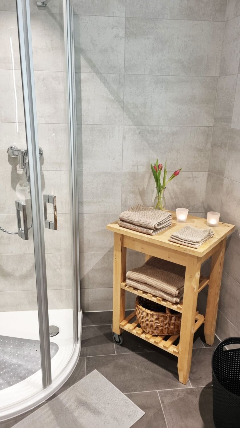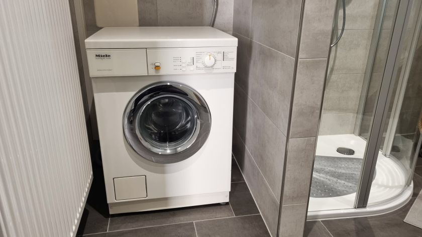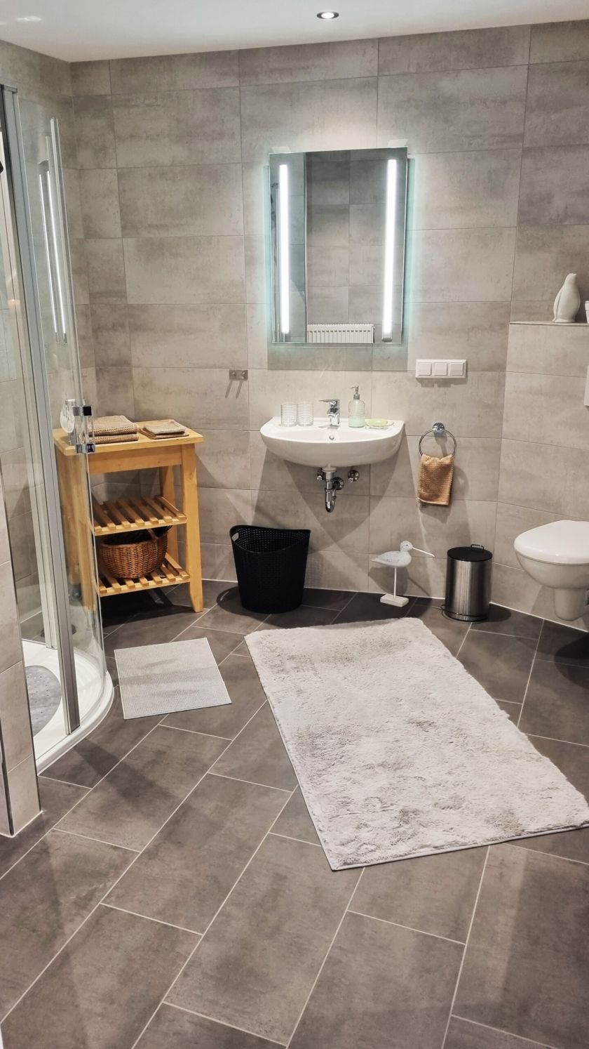• Großes, hochwertiges Badezimmer mit Dusche und WC, Föhn und Waschmaschine