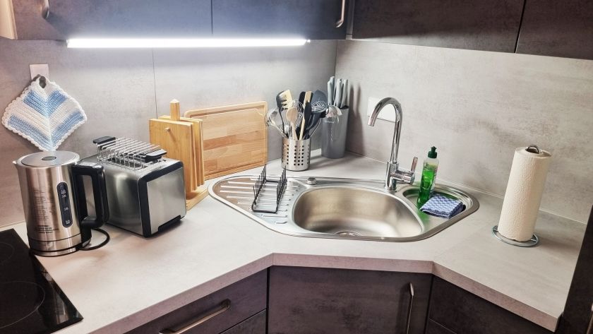 • Einbauküche mit voller Ausstattung (Ceranfeld, Backofen, Kühlschrank mit Gefrierfach, Wasserkocher, Kaffeemaschine, Toaster etc.)