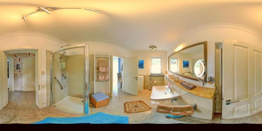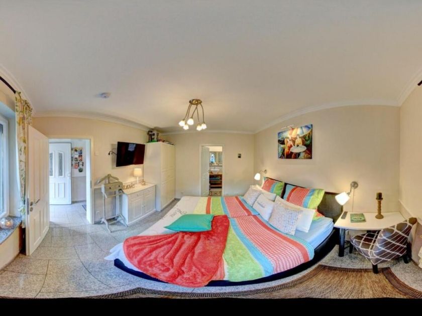 Das Obergeschoss ( 6 Pers.) hat 80 qm, 3 Schlafzimmer, mögliche Zustellbetten, bei Buchung des ganzen Hauses wäre der 2. Wohnbereich dieser Wohnung als separates Schlafzimmer nutzbar für bis zu vier Personen) + Küche, Flur u. Bad mit einer großen Dusche. Balkon mit Panoramablick über den See + eigene Terrasse mit Holzmöbeln und Grillkamin. Relaxen Sie und genießen Sie den Traumblick auf dem Badesee.