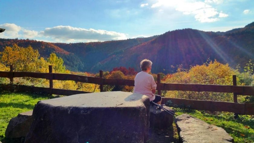 Hinter dem Haus befindet sich eine große Terrasse mit Blick in den Wald, Pavillon mit Außenmöblierung für bis zu 17 Personen und Grillkamin. Hier beginnt der Wald in Hanglage. Oberhalb des Tannen- und Buchenwaldes verläuft der Waldseepfad (Traumpfad).
