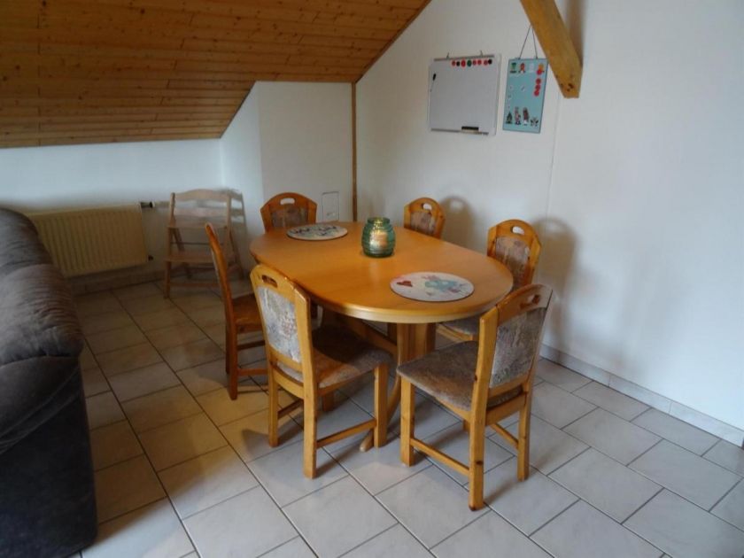 - 1 Wohnzimmer mit integriertem Wohn- und Essbereich, inkl. TV sowie Couch und Esstisch an dem 6 Personen Platz finden.