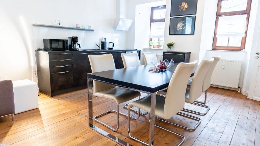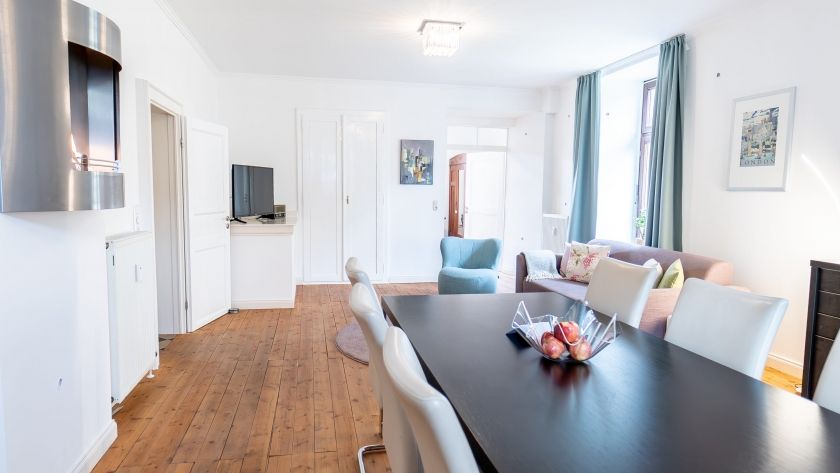 - Aus dem großen Wohn-Esszimmer der 77m2 Ferienwohnung heraus schauen Sie direkt in den begrünten Innenhof und auf den mittelalterlichen „Rapunzelturm“. Dieser Raum verfügt über eine moderne und sehr gut ausgestattete Küchenzeile, einen großen Esstisch sowie eine bequeme Sitzecke mit Sofa, Sessel und Fernseher. Hier können Sie perfekt gemeinsam kochen, essen, fernsehen oder spielen. Der offene Bioethanol-Wandkamin sorgt dabei für eine behagliche Atmosphäre.