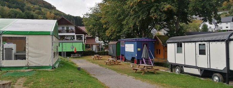 - 10 originell eingerichtete Bauwagen (35 Betten+6 mögliche Zustellbetten) und komplett ausgestattetem Küchenzelt mit Holzfussboden (6x8m)