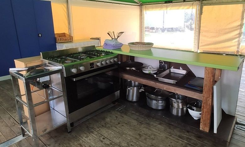 - 5 feststehende, komfortable Zelte und 2 Bauwagen (42 Betten) und komplett ausgestattetem Küchenzelt mit Holzfussboden (5x9m)