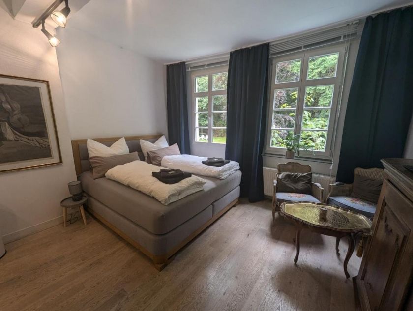 - Großes Schlafzimmer mit Boxspring-Doppelbett und Kleiderständer