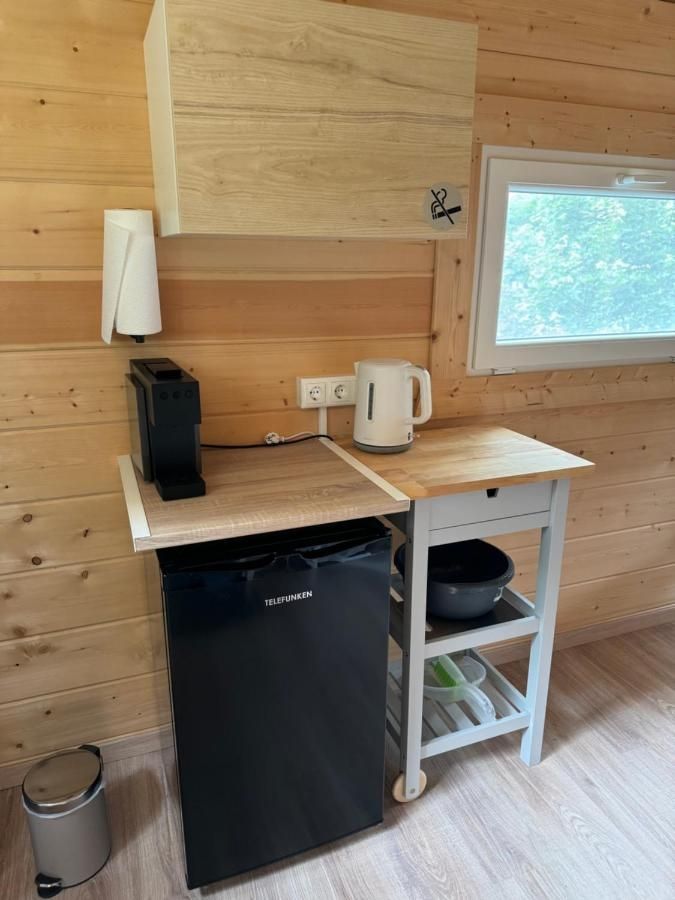 • Geschirr, Kaffeemaschine mit Kaffeekapseln, Wasserkocher, Kühlschrank