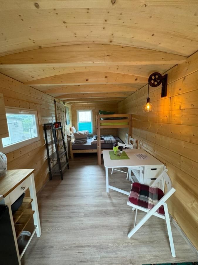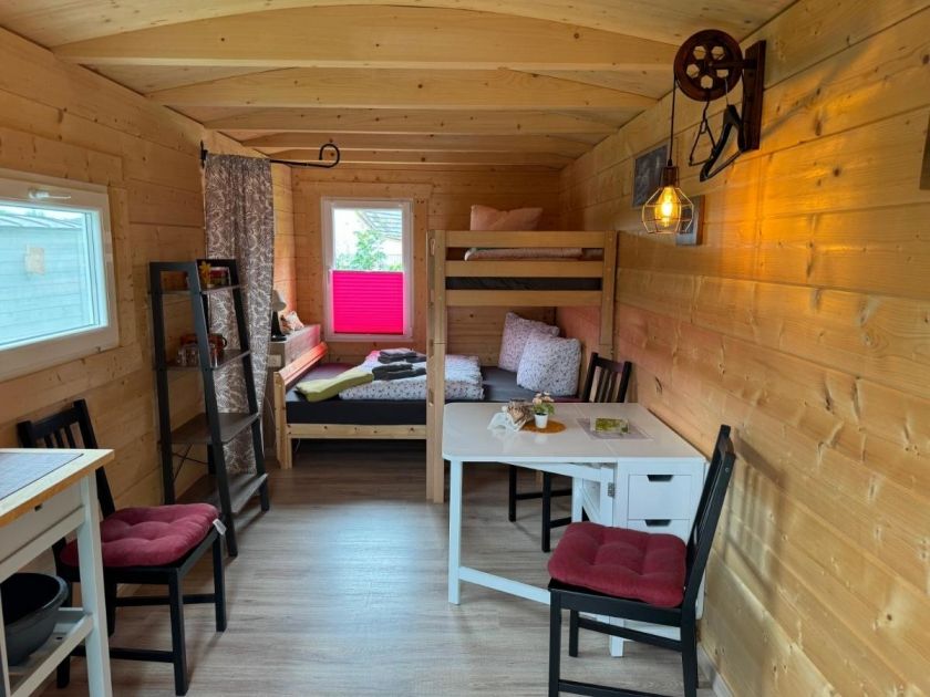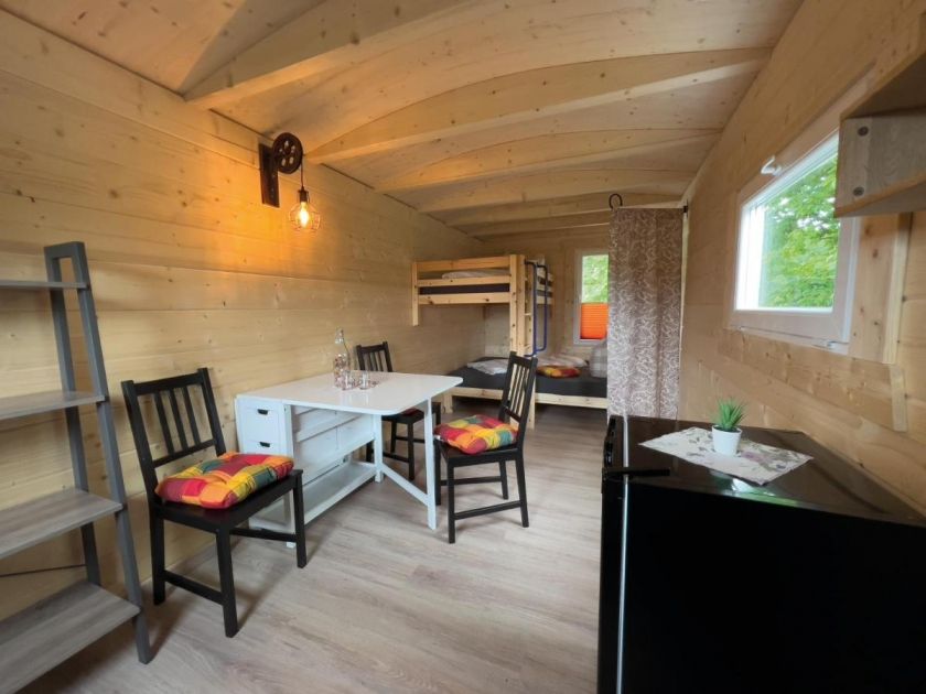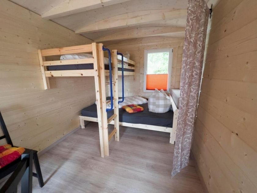 Die 3-Bett-Karren für 2 oder 3 Personen mit den Namen „Schäferkarren“, „Einhornhütte“, „Dumbo-Wagen“, „Bloxberg“, „Burgblick“ und „Köhlerwagen“ verfügen über ein Doppelbett, ein Etagenbett und auf Wunsch auch über ein Kinderbeistellbett.