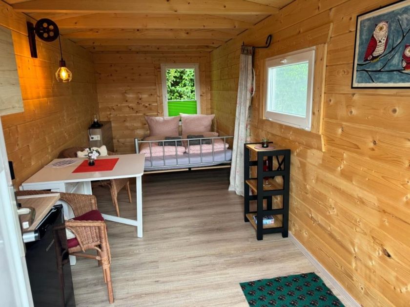 Idyllisch geht es in unserem 2-Bett-Karren mit dem Namen „Eulennest“ zu. Das „Eulennest“ ist lediglich mit einem Doppelbett für Verliebte ausgestattet. So kann man den Hochzeitstag, einen Geburtstag oder einfach nur ein romantisches Wochenende zu zweit mal ganz anders verbringen.