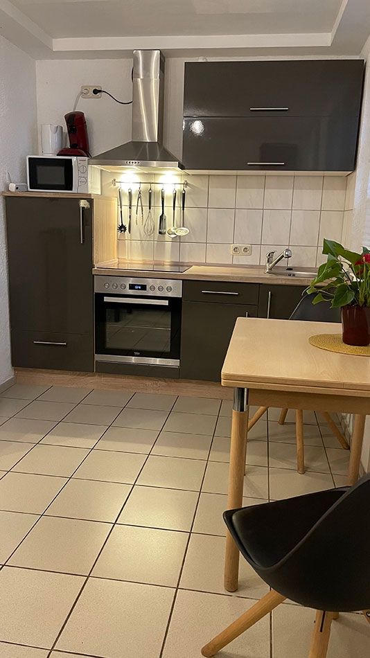 - Küche: Wasserkocher, Kochherd, Kaffeemaschine, Backofen, Mikrowelle, Kühlschrank (+ Gefrierfach)