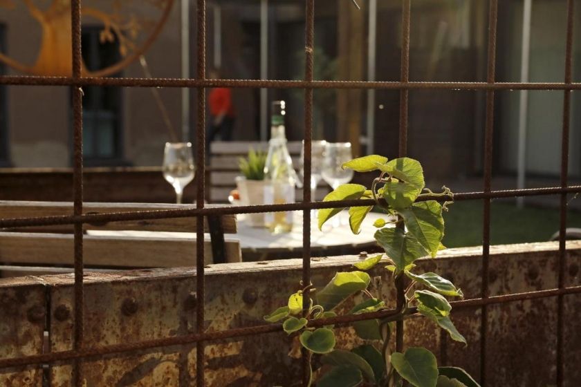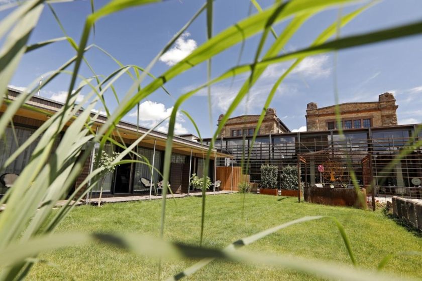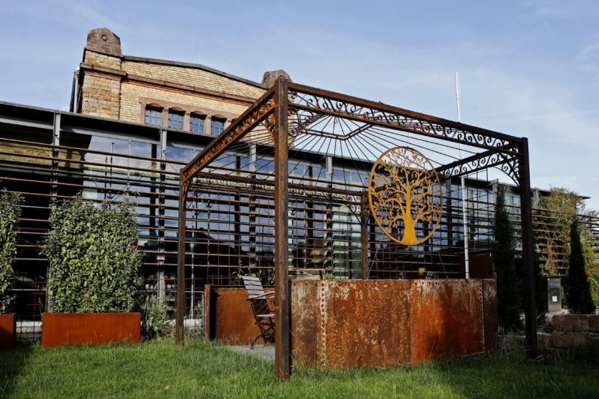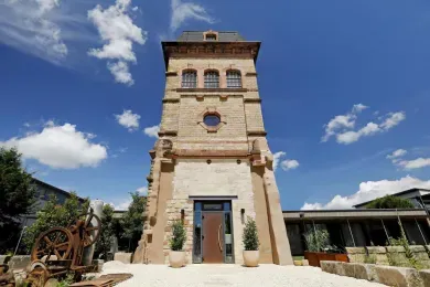 Das Anwesen mit dem historischen Wasserturm aus dem Jahr 1893 liegt an einem kleinen Stadtplatz am Flüsschen Queich im Zentrum von Landau in der Pfalz.