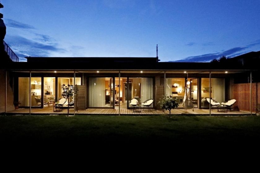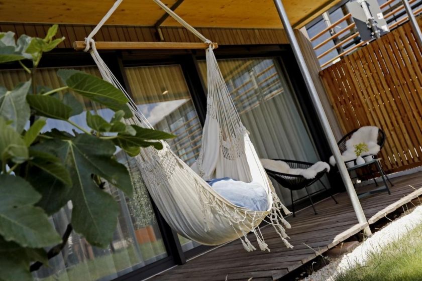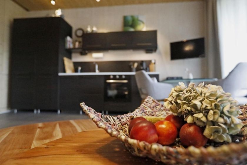 Der angegliederte Neubau mit den Ferienappartements ist in biologischer Massivholz-Bauweise erstellt. Zu jedem Appartement gehört eine großzügige, überdachte Terrasse als Loggia.